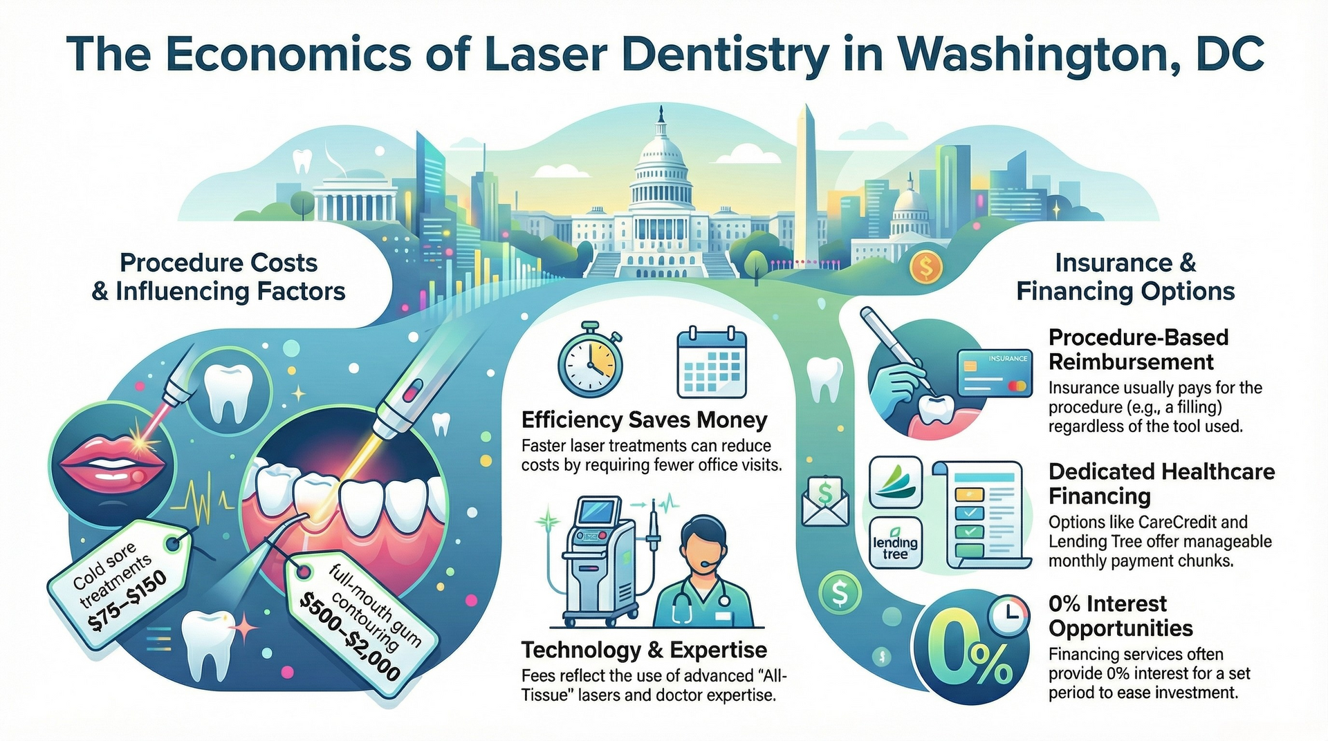 The cost of laser dentistry in DC varies depending on the complexity of the case. A simple cold sore treatment might cost between $75 and $150, while full-mouth gum contouring can range from $500 to $2,000. Because laser treatments are often faster, they can sometimes save you money on multiple office visits.
