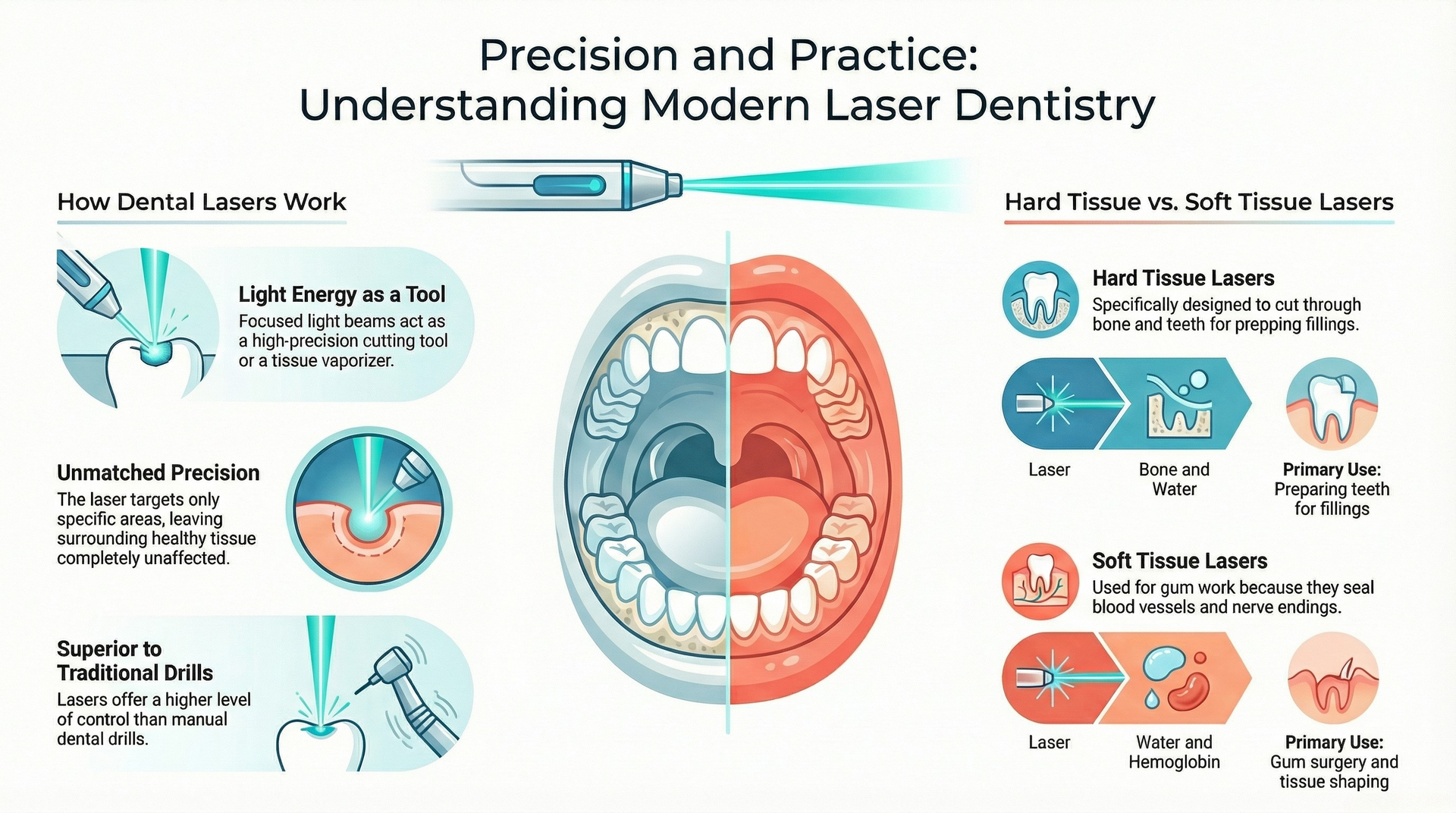 Soft Tissue Lasers: These are absorbed by water and hemoglobin (blood). They are ideal for gum work because they seal blood vessels and nerve endings while they cut.